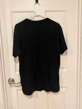 Black short-sleeve graphic T-shirt. Bold multicolor slogan print: blue, teal, cream, orange and red lettering. Casual crew neck style. Fun conversational statement piece.