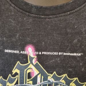 Distressed black boohooman graphic tee featuring a bold design. Perfect for casual outings.