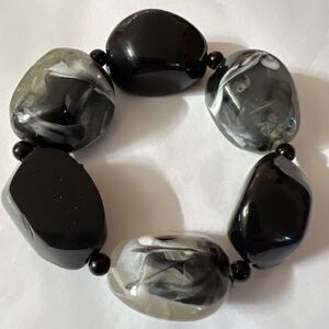 I am selling this as a set because I think it looks nice together even though the pendant is a natural snowflake Obsidian stone and the bracelet and earrings are plastic. Worn only once. The pendant stone came with a slash on the back, the front is lovely. The bracelet has black and clear chunky plastic stones adorned by small black beads. It has manufacturer marks and scratches on it. ( I think to appear as stones). Please see photos and use zoom. Earrings have no wear. They all look so nice together I didn't want to split them up. Perfect with a crisp white blouse or that little black dress. I am happy to answer any questions. Smoke free home. Thank you for shopping with me!