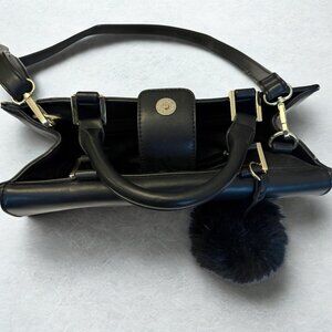 Versatile structured handbag in black with dual-tone gray suede panels and gold hardware. Comes with both handles and a detachable shoulder strap, plus a soft black furry charm for added style. Features a front pocket and magnetic snap closure. Slightly used with minor scuffs on the bottom.