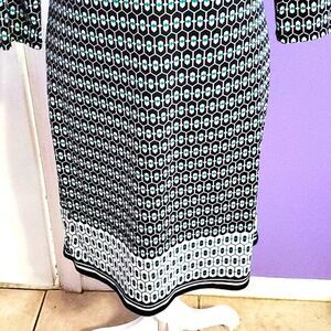 Black and green geometric shift midi dress. 3/4 sleeves and rounded neck. White, black and green contrasting pattern on the hem. No fabric tag, but it appears to be a polyester blend and is stretchy.