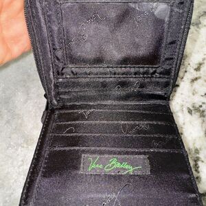 This is a pre-owned Vera Bradley wallet with a black cotton blend exterior and a floral pattern featuring green and pink flowers. It has a zip-around closure and a folding design. The wallet includes a coin pocket and a snap tab. The dimensions of the wallet are 4" in length and 4.5" in width.