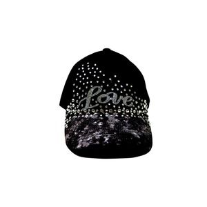 Flashy eye-catching glittery LOVE rhinestone embellished hip hop style black gray mineral print baseball cap hat . The rhinestone embellishments draw attention, making the wearer stand out in a crowd. It's perfect for those who enjoy being noticed and making a statement with their accessories. Versatile it can be worn while running errands dressed up or down, pairing equally well with casual streetwear or adding a touch of flair to more dressed-up ensembles for concerts parties or cruises. Adjustable