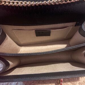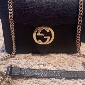 Chic beautiful bag in black leather. Features a stylish light gold chain with iconic Gucci logo detail. Excellent condition no marks on outside or inside.