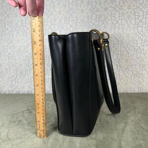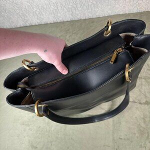 Black faux leather Guess tote purse with brushed brassy gold hardware. Comes with several pockets and compartments, big enough to fit an ipad/tablet/laptop and everything else you carry around. Some stains on the inner fabric but nothing major- outside is still gorgeous. Zipper moves freely, none of the hearware is loose. A great everyday staple bag.