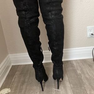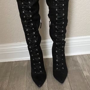 Over the knee Guess tie up lack boots. With a faint lace pattern