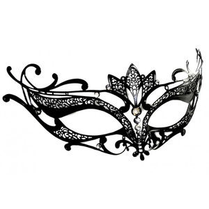 Beautiful scroll design in black, it is set with sparkling rhinestone accents with a satin ribbon tie closure. Beautifully made and finished, it is lightweight and flexible - bend or straighten slightly to fit any adult face.