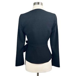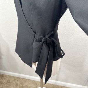 Black Halo Apollo Two Piece Pant Suit Black. Two-piece suit jumpsuit featuring a crossover peplum wrap blazer top and coordinating pant in smooth stretch fabric. Lined. Polyamide/viscose/elastane. Dry clean. Made in USA. Blazer suit top has an adjustable wrap waist and slit sleeves. Bottoms are a wide leg fit. *Shown on model in blue color. Business jumpsuit. Perfect for a holiday party outfit as well!