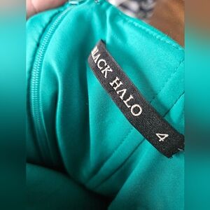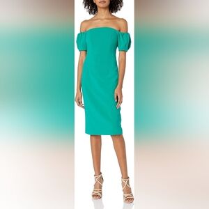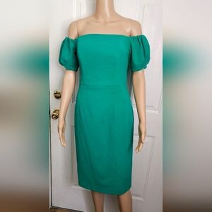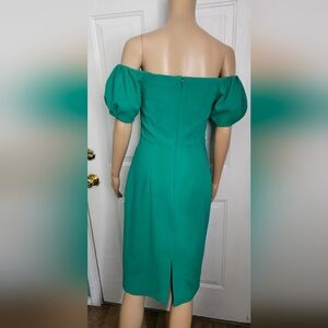 Puff sleeves add a hint of volume to this off-shoulder Black Halo dress. Boning structures the bodice. Center slit and hidden zip in back. Lined.