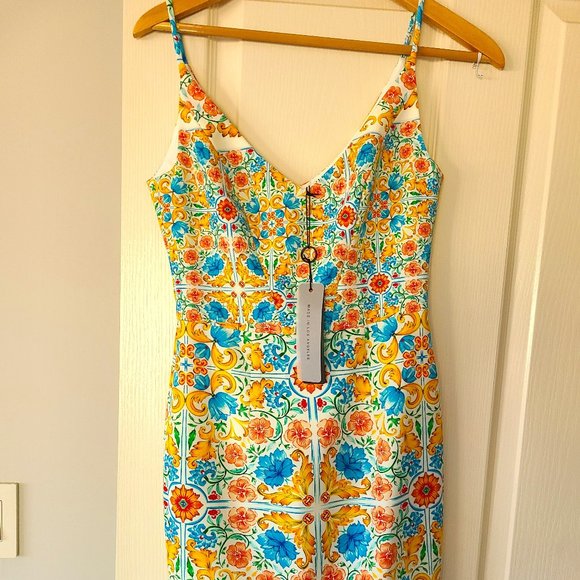 Vibrant floral print dress. Features a fitted silhouette. Spaghetti straps and V-neckline. Perfect for summer occasions.