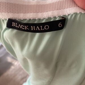 This Black halo dress is perfect for your daytime spring and summer events! it has a gorgeous floral print on a light cyan back drop. its fitted and knee length, with a flirty off the shoulder neckline. its in excellent condition - no flaws.