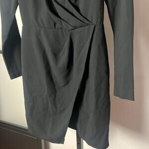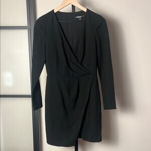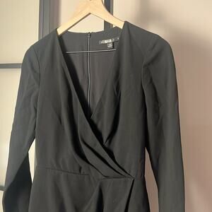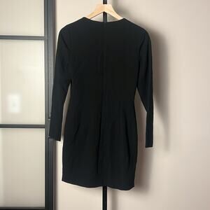 Black crepe (62% Polyamide, 32% Viscose, 6% Elastane). Sheath. Long sleeves. V-neckline. Hidden back zipper closure. Partially lined. 34" from shoulder to shortest hemline, 37" from shoulder to longest hemline. Made in the USA.