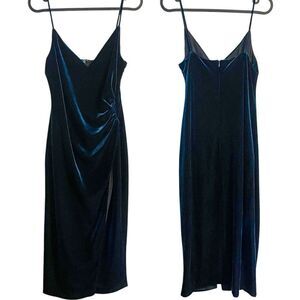 Features: sleeveless, spaghetti straps, V neck, hidden back zipper, side slit, ruched waist, lined, tailored fit