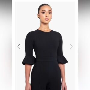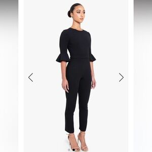 The jumpsuit is cut from our Double Face Viscose Blend and is styled with a fjewel neckline, 3/4 sleeves with ruffle cuff and cropped tapered leg. Lined bodice with center back hidden zipper. Inseam measures 28"