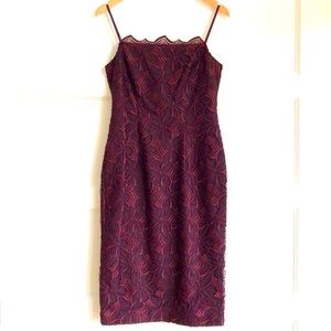 Elegant Black Halo Sora Lace Sheath Dress in Metamorphosis, Sz 4. Gorgeous, deep burgundy midi dress, beautifully delicate, embroidered floral lace overlay, spaghetti straps and a feminine, super flattering scalloped square neckline. Princess seaming & concealed back zip closure for a sleek fit. Center back slit hem. Fully lined.