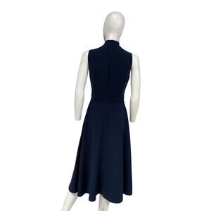 Black Halo 'Carolina' Blue Polyamide Dress Size 4: mid-weight stretch crepe, midi length, tie neck, hidden zip at back, on-seam hip pockets, lined, a-line silhouette.