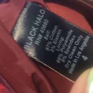 Black Halo Eva Ruffle Sheath Dress in burgundy floral print