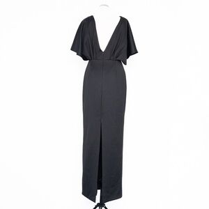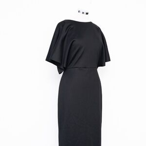 Sophisticated and timeless, this Black Halo Eve by Laurel Berman gown features a sleek black silhouette with dramatic cape sleeves and a back slit for easy movement. Crafted in a luxurious stretch fabric blend for a flattering, form-fitting drape. Perfect for evening events or formal occasions.