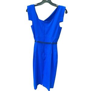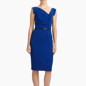 The sleeveless Jackie sheath dress from Black Halo flaunts draped detailing at the bodice and a removable, contrast buckle belt.