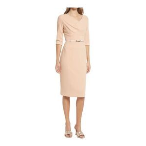 Designed with a sheath silhouette, Black Halo's Jackie O loft woven dress features a draped neck, three-quarter-length sleeves, and a leather belted waist.