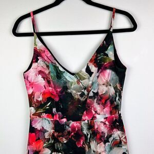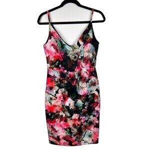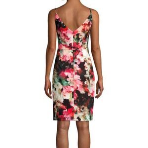 Black Halo Jevette Floral Cocktail Sheath Dress. This sleeveless mini dress hits just a bit higher than the knees and features a beautiful multicolor flower print in shades of black, red, green, and pink. Strappy sleeves and a sexy v neck add the perfect compliments to this date night designer dress. Style # 1819376. Excellent condition. Women's size 6, measurements pictured.