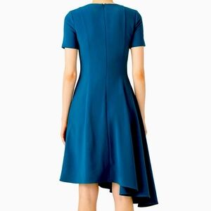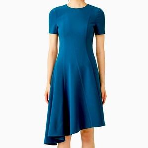 A sweeping asymmetrical hemline and contoured seams add subtle drama and dimension to this sophisticated dress.