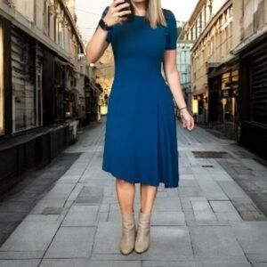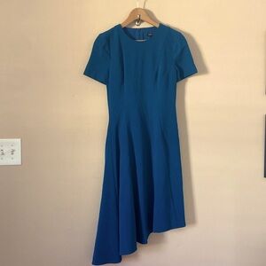 This elegant dress features an asymmetrical hemline and a flattering A-line silhouette, offering a modern and sophisticated look.