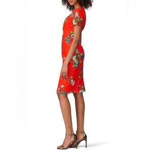 Tangerine red linen (Self: 90% Polyamide, 10% Elastane Lining: 96% Polyamide, 4% Elastane). Sheath. Short sleeves. Crew neckline. Hidden center back zipper. Fully lined. 40" from shoulder to hemline. Made in the USA.