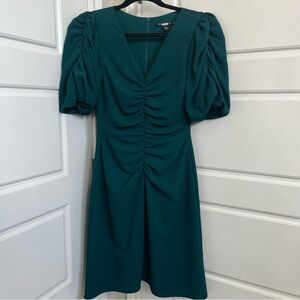 Pine green crepe (99% Polyamide, 1% Elastane). Hourglass. Short sleeves with puff detail. V-neckline. Hidden center back zipper closure. Fully lined.