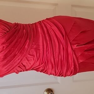 Sexy Black Halo Ruby Red, Ruched, Silky, Faux Wrap, Form Fitting Cocktail Dress. Too sexy for words! Size S. Gorgeous draping and shine. NWT. Not sure if it is suitable for Prom, but definitely great for a Cruise or Formal event! 100% Viscose. Made in the USA! Shown on a size 6 mannequin.
