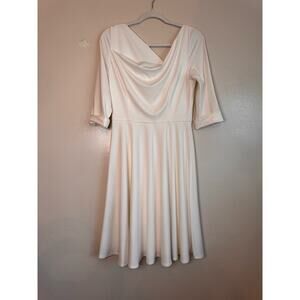 The Black Halo Jackie O Swing Dress cream is a knee-length dress with a center back zipper closure, draped neckline, and 3/4 cuffed sleeves. It falls 40 inches from the shoulder and is fully lined