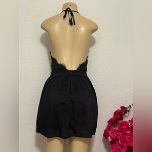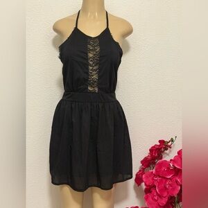 This elegant black dress features a halter neckline and a striking open back, ideal for cocktail events or a night out. The sleeveless design and flowy skirt create a feminine silhouette, while the lace detailing adds a touch of sophistication.
