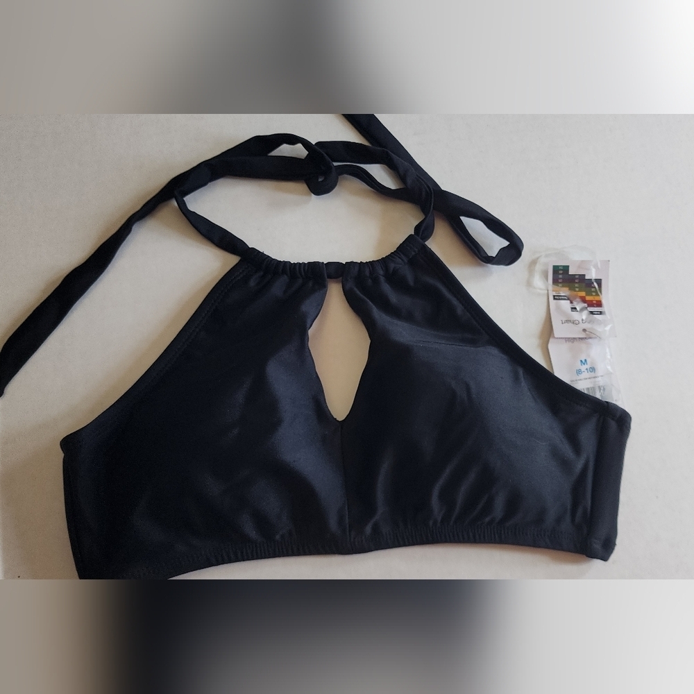 Stylish black halter bikini top with a keyhole design. Perfect for beach days.