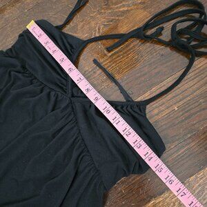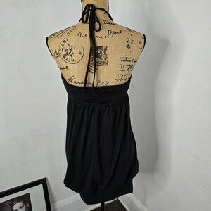 DETAILS: V-neck tie neck halter top mini dress. Slightly looser, flowy fit throughout body. It does have some stretch across chest.