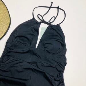 A tied keyhole neck and shirred body flatter the figure on this halter neck tankini