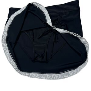 The halter neckline ties at the neck for an adjustable fit, and the built-in swimsuit underneath provides both comfort and support. The playful contrast trim adds a unique and eye-catching detail to the classic black design.
