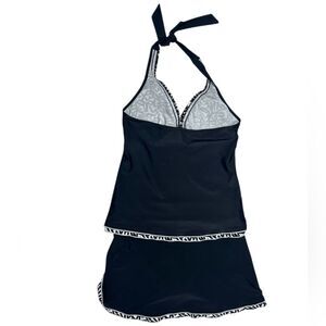 Stylish and versatile black halter tankini swimsuit featuring a chic geometric trim for a touch of modern flair. This top and swim skirt offer great coverage with a flattering fit, perfect for lounging by the pool or enjoying a beach day.