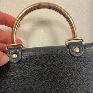 This stylish black handbag features luxurious gold accents, perfect for any occasion. Its sleek design and high-quality materials make it a must-have accessory.