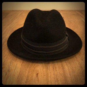 This is a black hat with a subtle red, white and black band. Ino marks, stains or scuffs of any kind.