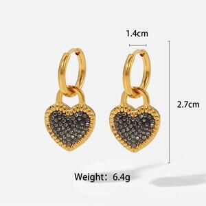 Black Heart Pendant Zircon Hoop Earrings - 18K Gold Plated Stainless Steel