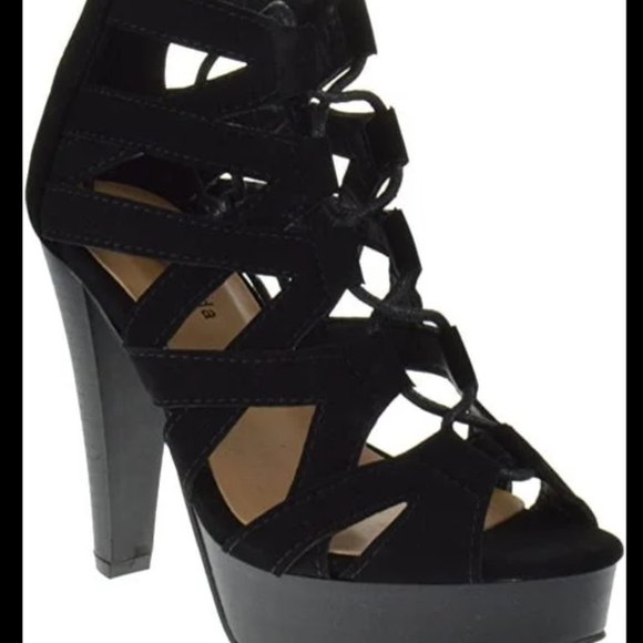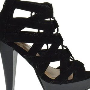 Strappy High Heel Pumps, Peep Toe, Lace Up, Zipper closure in the back. 4.5" heel w/1" platform. Never been work, except to try on in house. New.