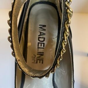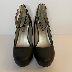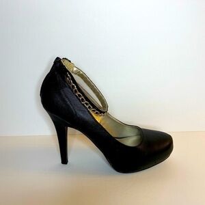 Pre-loved black heels. Good condition. Minor wear shown in photos. Some peeling on the inside of shoe. 5” heel. Gold chain detail around ankle. These heels zip up in the back. No trades. Smoke free and Pet free environment. Thank you!