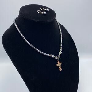 Black Hematite 17"Drum Barrel Agate Cross Pendant Faux Pearl Earring Bundle