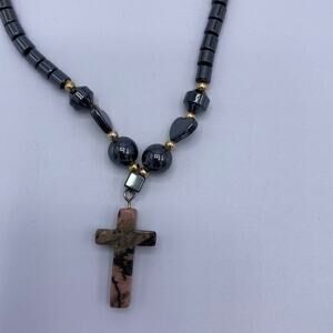 Black Hematite Drum Barrel Agate Cross Pendant Faux Pearl Earring Jewelry Bundle
