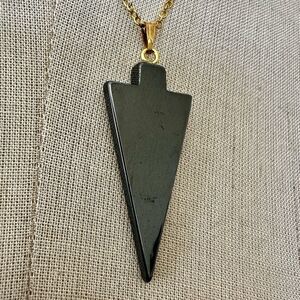 Minimalist with an edge! This necklace features a polished black hematite stone carved in a geometric arrowhead shape, hanging from a delicate gold tone chain. Simple, bold, and easy to style with just about anything.
