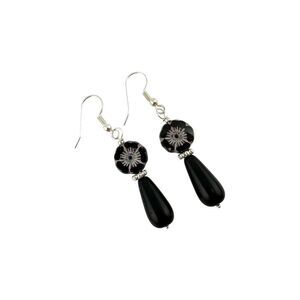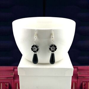 HANDCRAFTED — black Czech glass hibiscus flowers and teardrops drop dangle from silver plated ear wires for pierced ear lobes. These vintage style earrings are about 2 1/4" tall. Wire wrapped at top. Earrings come with ear wire stoppers. Handcrafted by me -- nspearson in my home studio. Brand new, never worn. Excellent condition. Wear with just about everything.