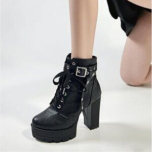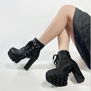 Black High Heel Boots For Women Platform Combat Booties Lace Up Goth Chunky Heel