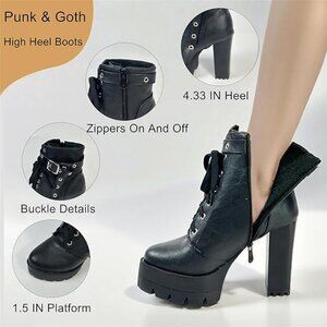 Stylish & Comfortable High Heel Boots for Women :Elevate your style with our chunky heel boots, perfect for women seeking both fashion and comfort. These goth-inspired platform ankle boots are designed for all-day wear, featuring a sturdy 4.33 IN heel and 1.5 IN platform height.these gothic boots will keep you looking fabulous and feeling great.