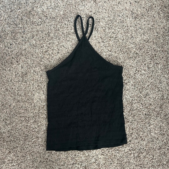 Old Navy fitted black top with high halter neck line with crossing straps.