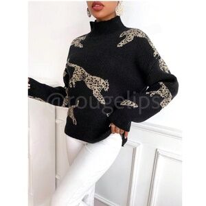 Black High Neck Knit Pullover Sweater Leopard Cheetah Print